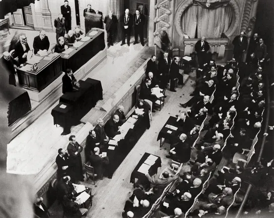 | 10 juillet 1940. Réunis au théâtre du Grand Casino à Vichy, les parlementaires menés par Laval (ici à la tribune) anéantissent la république |